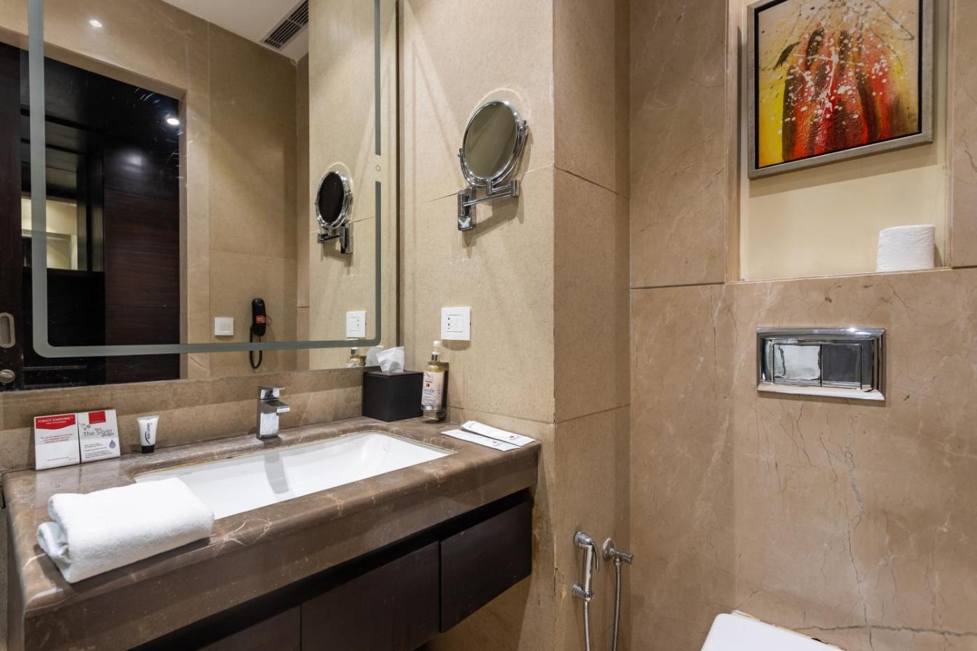 Suite. The air-conditioned suite has 1 bedroom and 1 bathroom with a bath and a shower. The suite offers a flat-screen TV, a minibar, a tea and coffee maker, a seating area as well as city views. The unit has 1 bed.